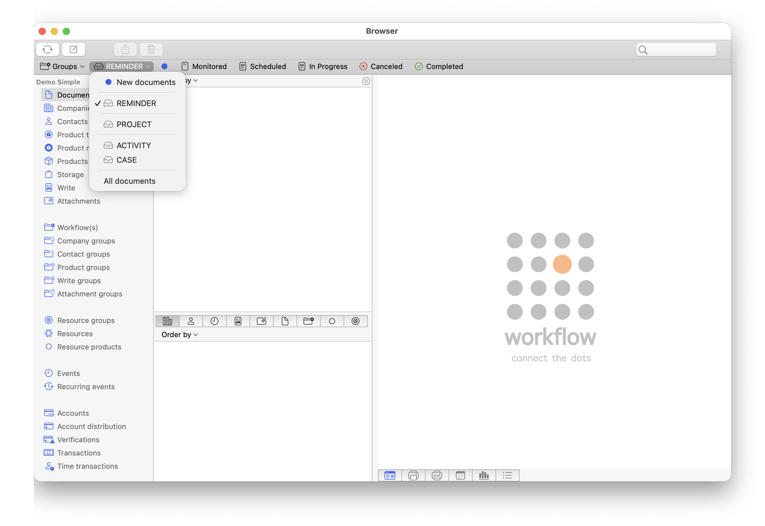 Workflow is an application for organizing work using documents, drawers, statuses, and relationships. The system can be used to manage many different kinds of work, such as reminders, projects, activities, cases, orders, or other document-based processes.